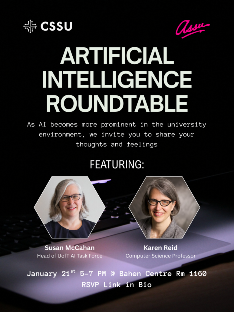 As AI has become increasingly prominent in the university environment, so have students’ feelings on the matter; come and share yours at the ASSUxCSSU AI Roundtable! This event will feature a panel of professors engaged in AI and pedagogical research—including Professor Susan McCahan, head of the U of T AI Task Force and the Provostial Advisor on Artificial Intelligence, and CS Professor Karen Reid, whose work focuses on the development of classroom-oriented tools.