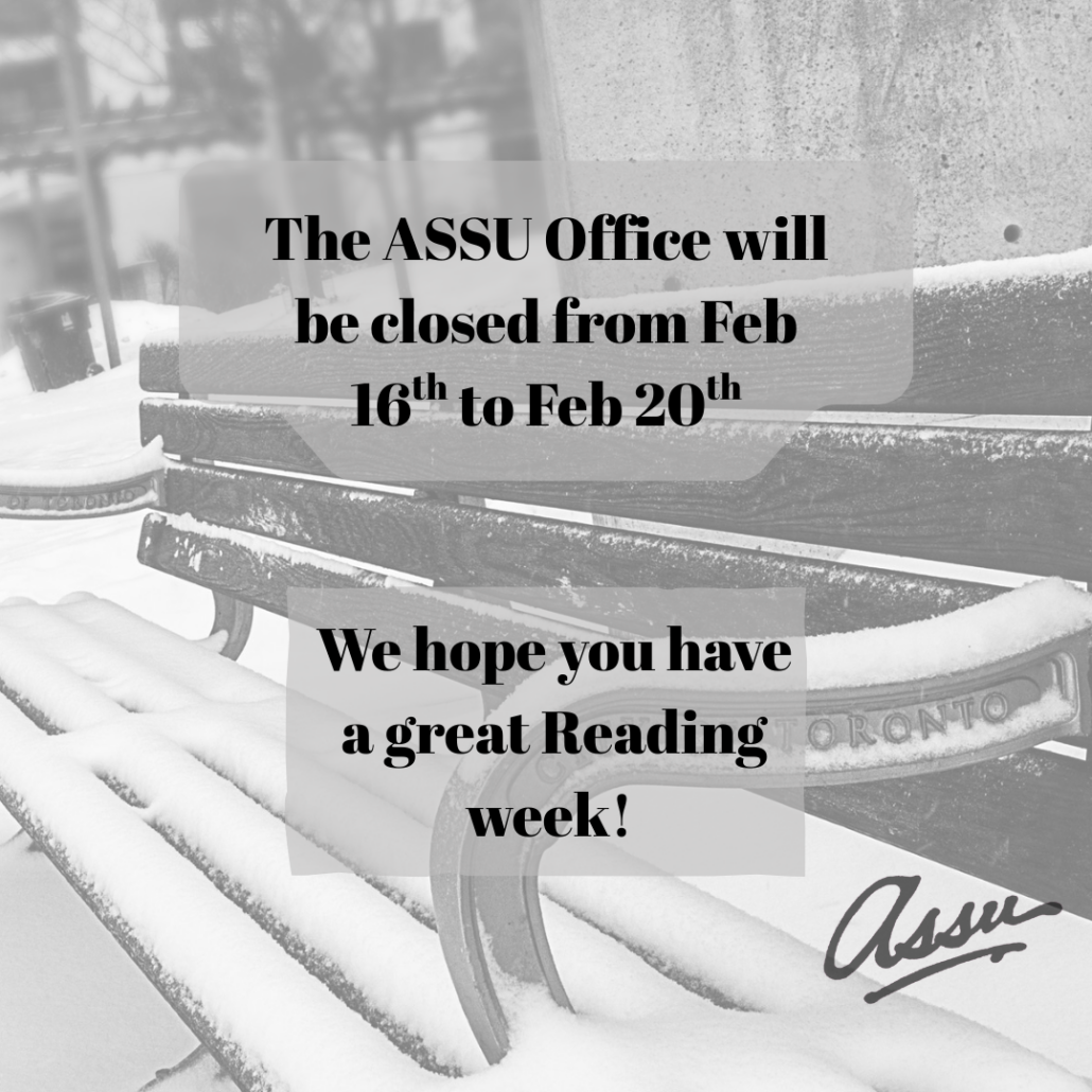 The ASSU Office will be closed for Reading Week from Feb 16th to Feb 20th. We will reopen on Monday Feb 23rd at 10am.